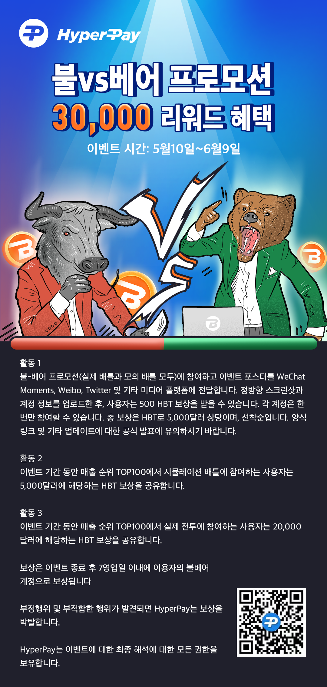 불-베어 프로모션(실제 배틀과 모의 배틀 모두)에 참여하고 이벤트 포스터를 WeChat Moments, Weibo, Twitter 및 기타 미디어 플랫폼에 전달합니다. 정방향 스크린샷과 계정 정보를 업로드한 후, 사용자는 500 HBT 보상을 받을 수 있습니다. 각 계정은 한 번만 참여할 수 있습니다. 총 보상은 HBT로 5,000달러 상당이며, 선착순입니다. 양식 링크 및 기타 업데이트에 대한 공식 발표에 유의하시기 바랍니다.