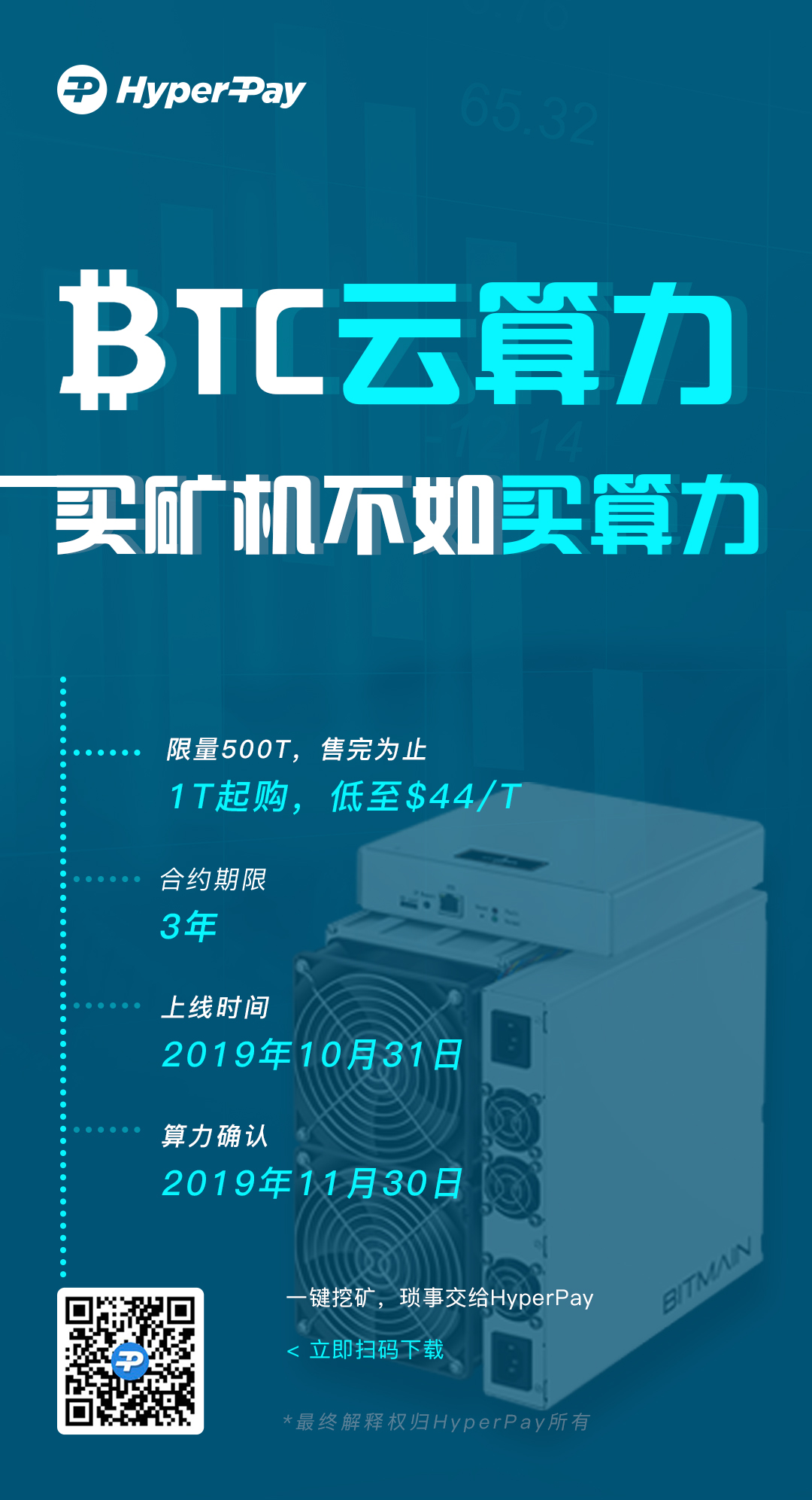 HyperPay于2019年10月31日隆重上线BTC云算力期货版。11月30日统一确认算力,12月1日发放首笔收益。