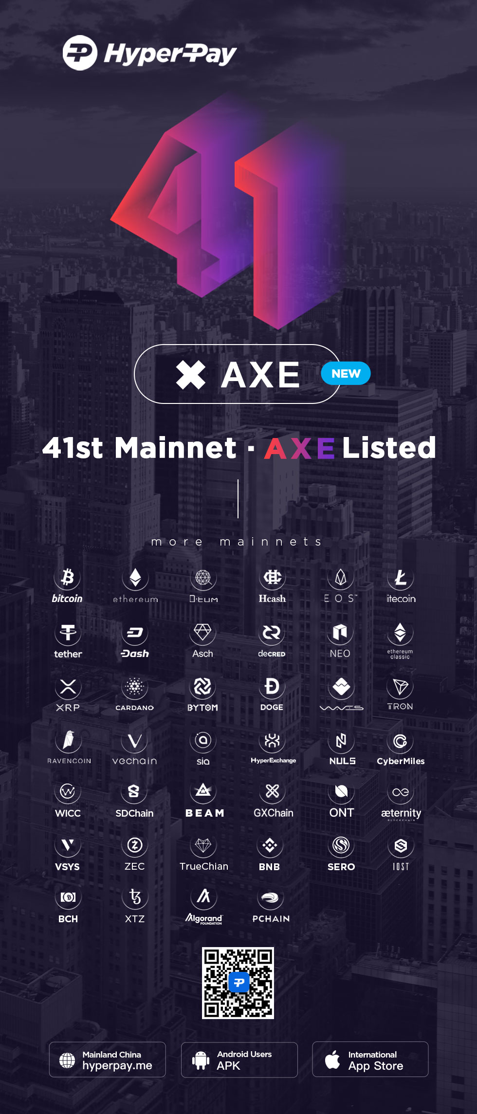 HyperPay has listed mainnet AXE and has supported 41 mainnets in total.